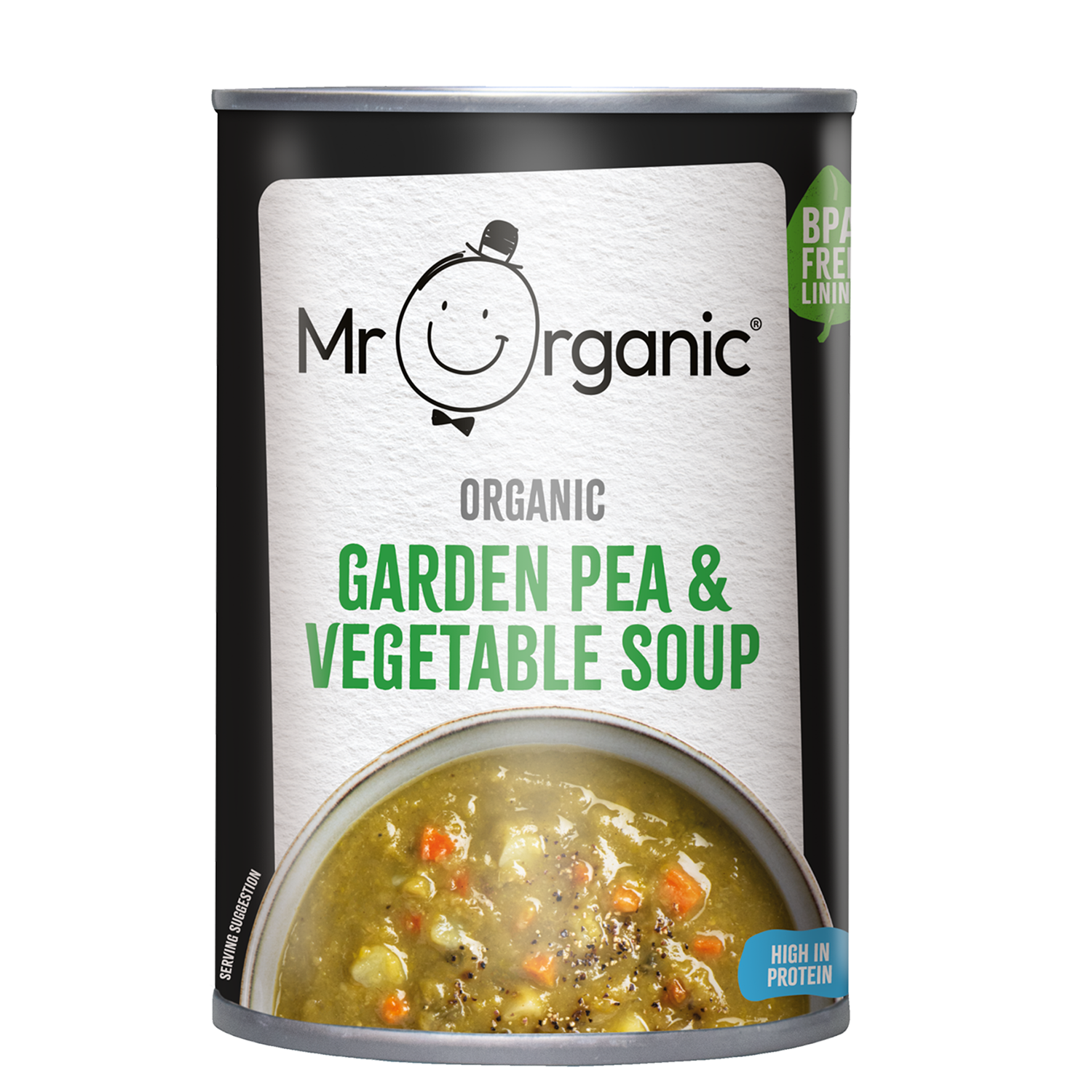 Pop open a tin of Mr Organic Garden Pea & Vegetable Soup for a warming meal in minutes. Lovingly crafted in Italy by our Chef, Giovanni, this soup is made with peas, carrots, celery, and potatoes – using only organic ingredients, made with no preservatives.