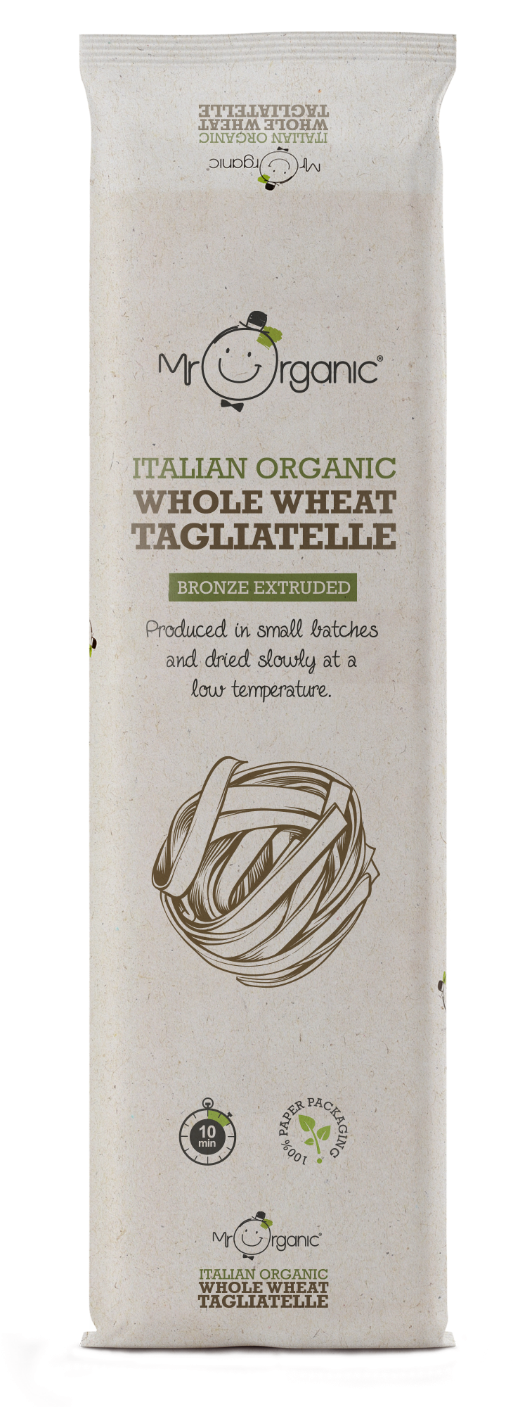 Our organic Whole Wheat Tagliatelle is made from 100% Italian durum wheat semolina in Canosa di Puglia, a region known as the ‘granary’ of Italy. It is bronze extruded to create a rough texture that helps it soak up more sauce for authentic texture and taste. Packed in recyclable paper packaging, our Pasta is better for the planet and full of organic goodness!